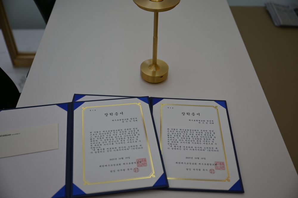 오늘 예배순서에는 예수로광염교회 장학금 전달 순서가 있습니다.
