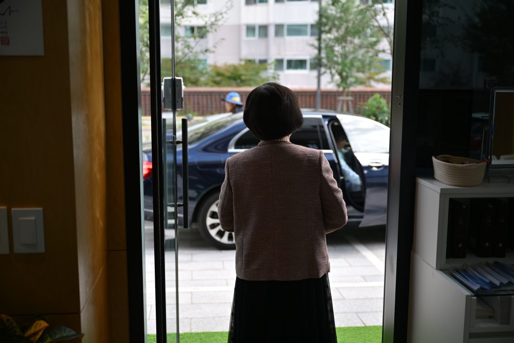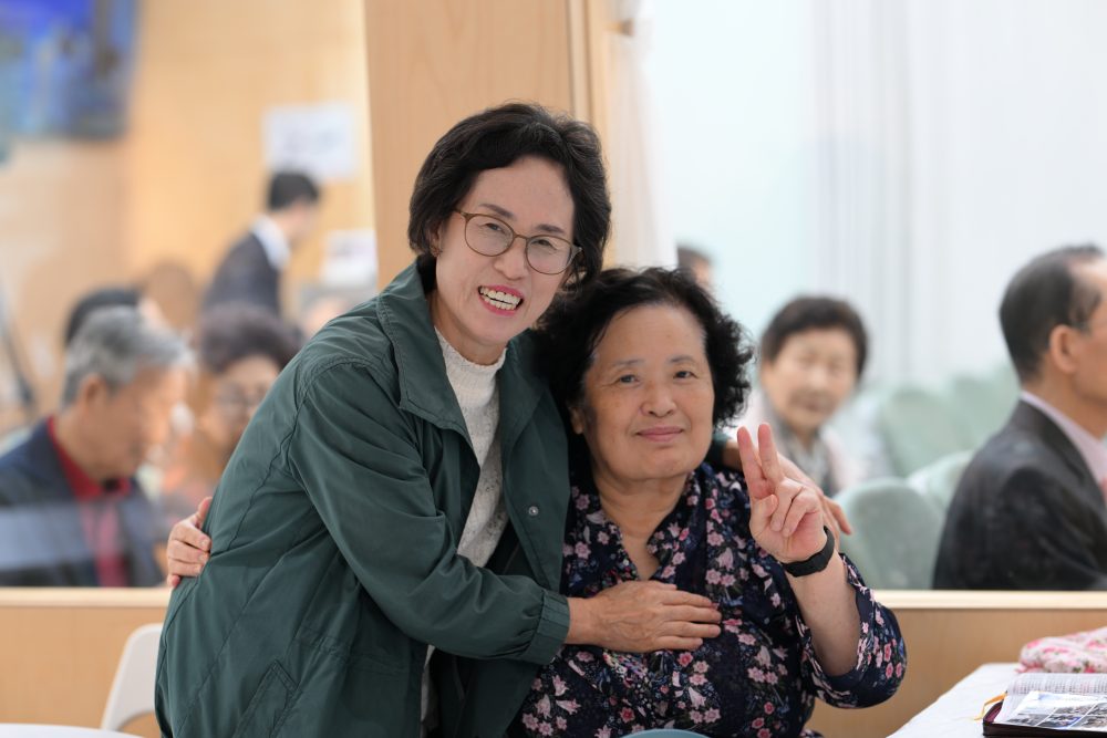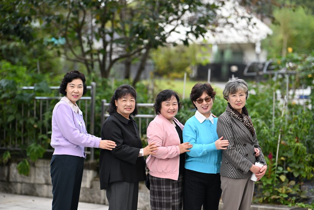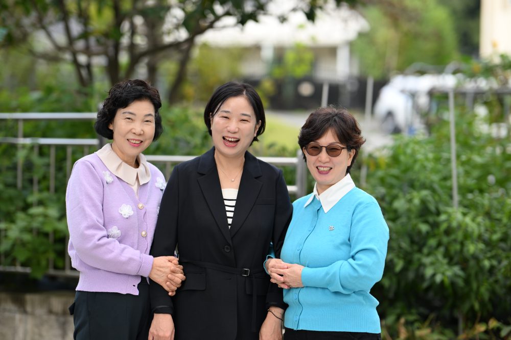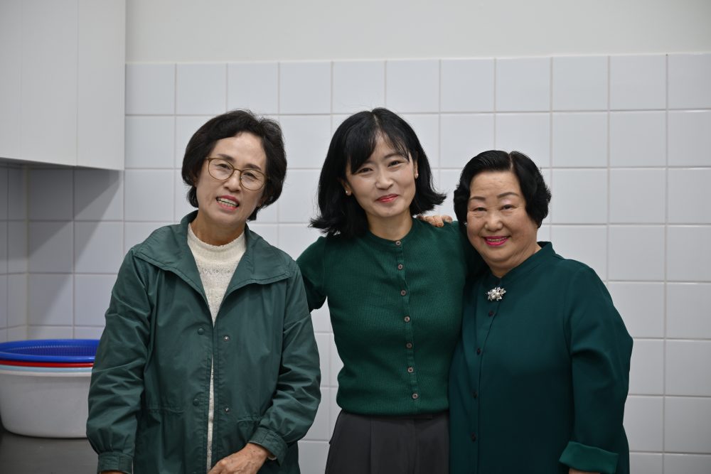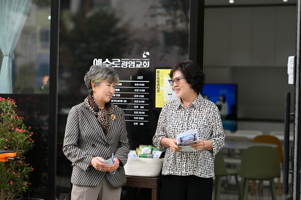 예배당에 오시는 성도들을 맞이하는 권사님의 모습..
