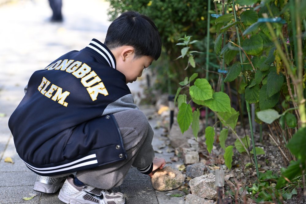 교회 앞 화단에 살고 있는 다양한 생물에 관심이 많은 하 임 군…