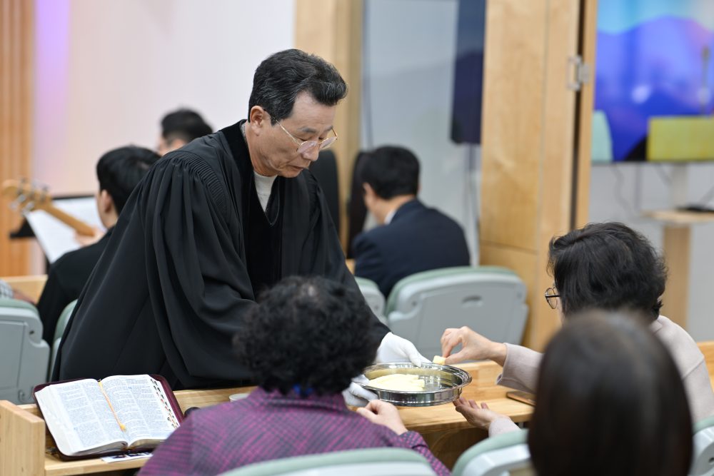오늘은 성찬식이 있는 날입니다. 강상민 형제와 김묘향 권사님이 악기 연주로 하나님을 찬양하였습니다.