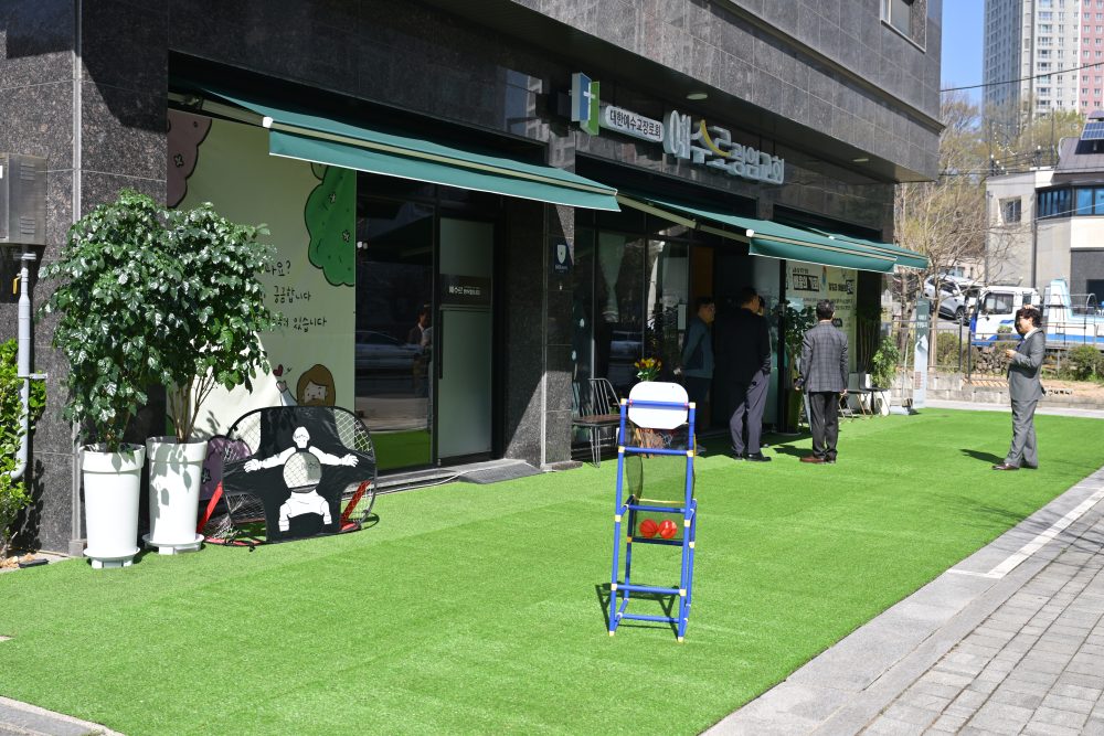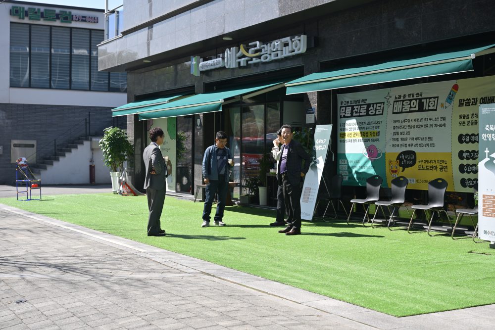 예배당이 조금씩 예쁘게 더 바뀌어 가고 있습니다. 교회앞에 차들은 없고 성도들이 즐거이 교제하고 있습니다.